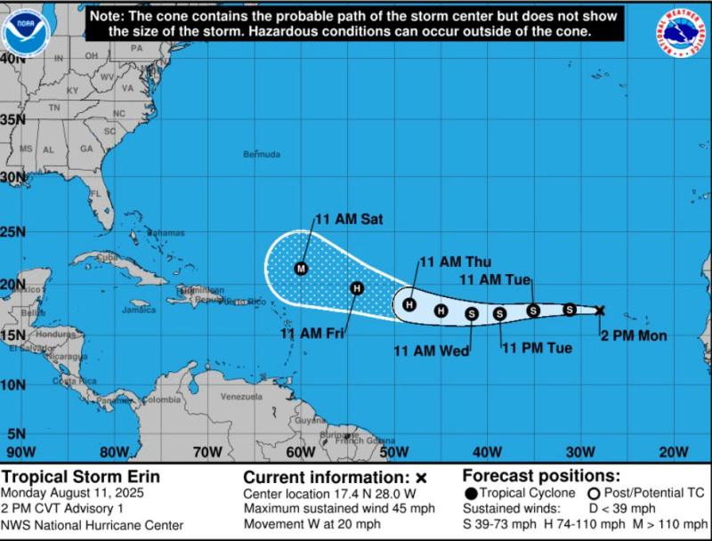 “Trayectoria pronosticada de la Tormenta Erin: se espera que en los próximos días las condiciones ambientales sean propicias para que se intensifique a huracán” escribió Ceballos en su cuenta de X.