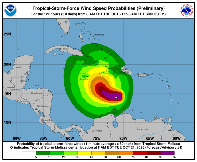 De acuerdo con el más reciente boletín del Indomet, la tormenta tropical Melissa se mueve hacia el oeste a unos 22 km/h y se espera se sea más lento su movimiento de traslación, seguido de un movimiento hacia el noroeste y norte. Tiene vientos máximos sostenidos de unos 85 km/h con ráfagas superiores y se espera un fortalecimiento durante los próximos días. Este sistema podría convertirse en huracán.